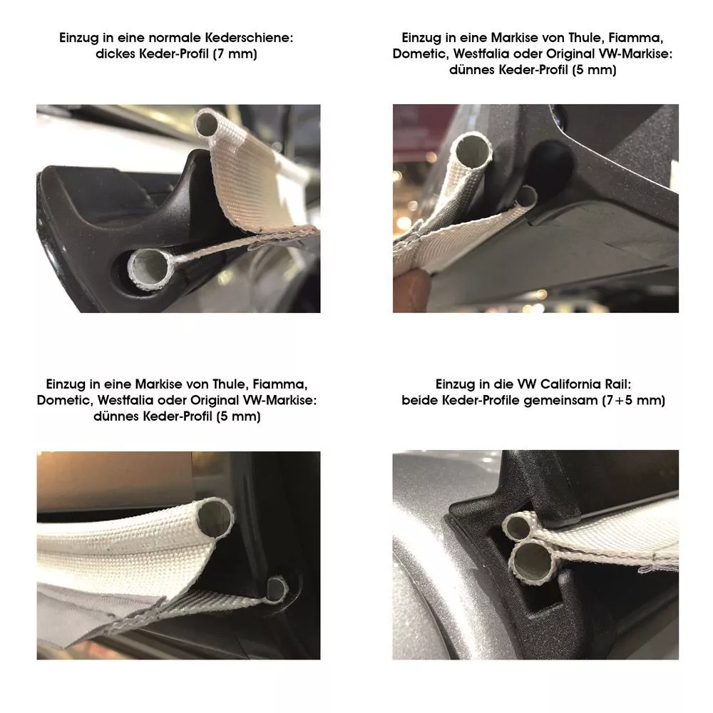 Einzug in eine Markise von Thule, Fiamma, Dometic, Westfalia oder Original VW-Markise: dünnes Keder-Profil (5 mm)