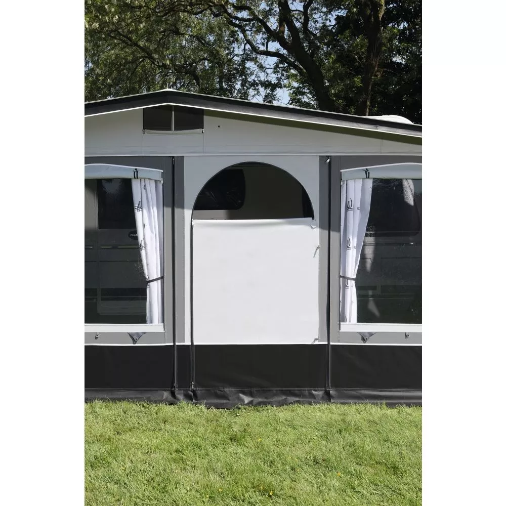 Die Vorderwandteile, betehend aus mehreren Fensterelementen und einem Türelement, sind bliebig gegeneinander tauschbar. So kannst du die Eingangsposition in dein Vorzelt selbst festlegen. Die grossen Fenster lassen viel Licht ins Innere. In Kombination mit den mitgelieferten Gardinen ist für ein angenehmes Wohngefühl gesorgt. Wenn du mal länger unterwegs bist oder keine Blicke ins Innere wünschst, kannst du die Fenster einfach mit den Fensterklappen blickdicht verschliessen. Besonders praktisch und nützlich sind die Fenster-Klappen an Tagen mit schlechterem Wetter. Zudem ist das Caravanvorzelt auf beiden Seiten mit einer praktischen, überdachten Allwetter-Belüftungsöffnung ausgestattet. Das robuste 28,0 x 1,0 mm Stahlrohrgestänge mit PowerGrip-System und Vordachverstärkung gehört ebenfalls zur Serienausstattung.