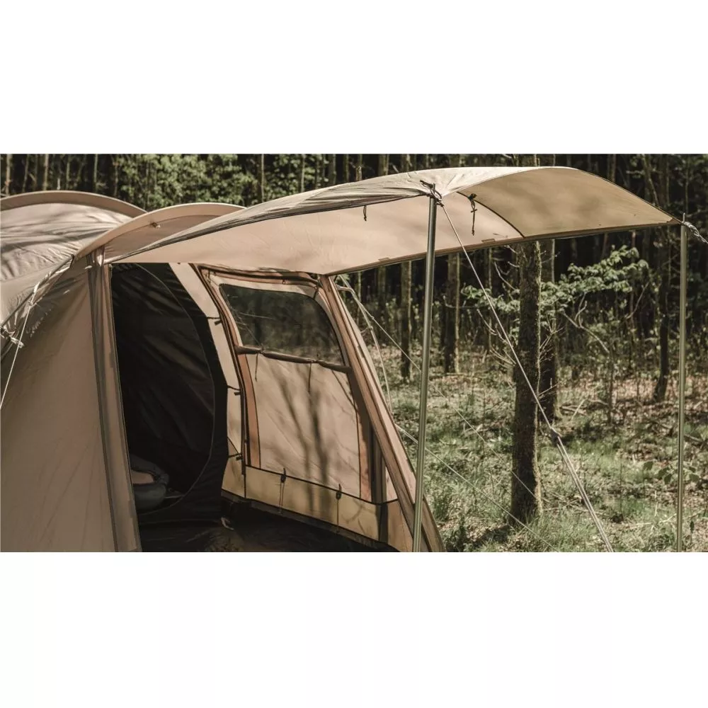 Ein regengeschützter überdachter Seiteneingang ermöglicht stets trockenen Zugang in das Zelt.