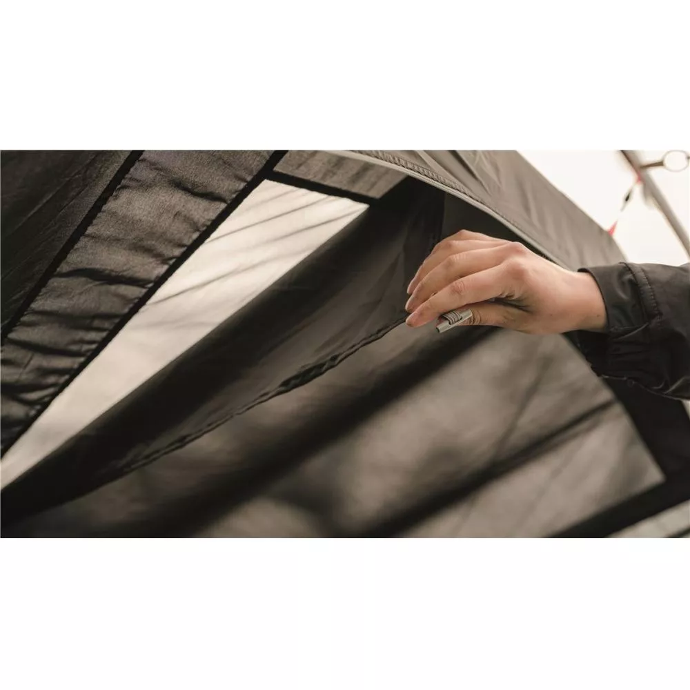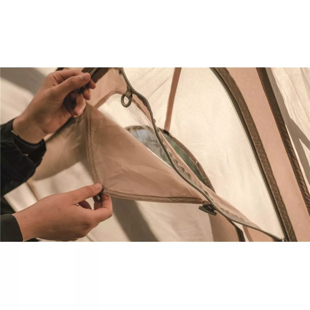 Im hinteren Bereich regulieren niedrig angeordnete Lüftungsöffnungen die Luftzufuhr. Durch Netzeinsätze hinter den Aussentüren wird die Belüftung zusätzlich unterstützt und dabei lästige Insekten aus deinem Campingzelt ferngehalten. Das Fenster des vier Personen Zelts ist ebenfalls mit einem Netzeinsatz versehen und zudem mit einem wasserdichten Vorhang ausgestattet.